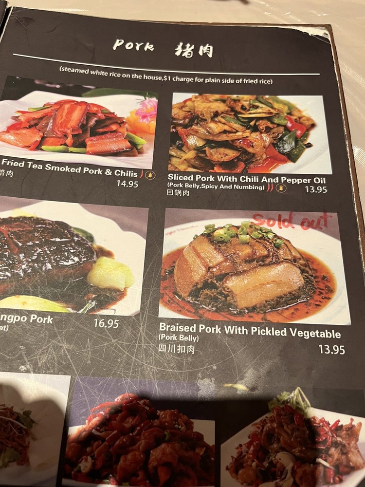 Sliced lamb, szechuan pickle veggie, chilis and pepper corn.